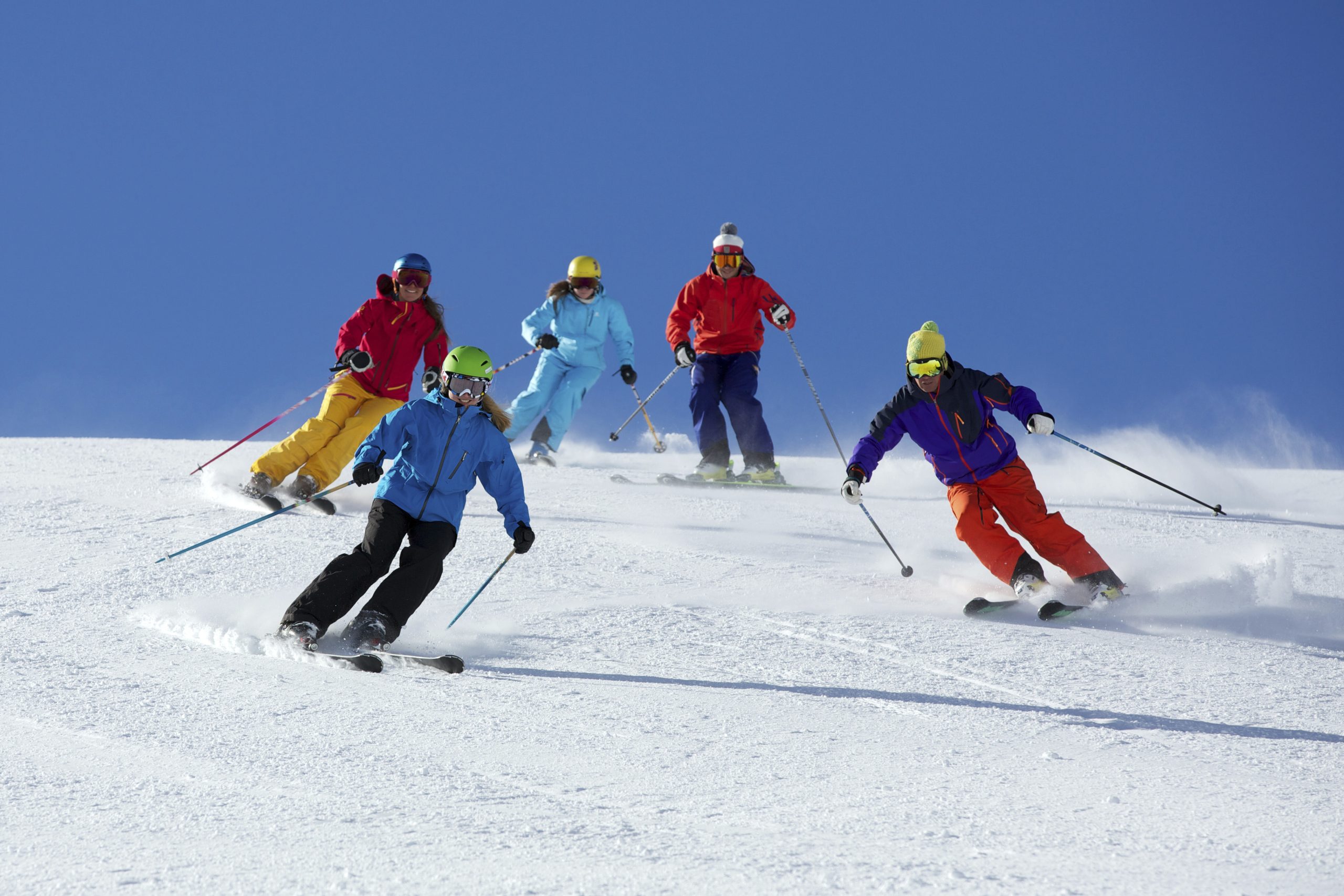 A group of people skiing down a snowy slope under a clear blue sky.