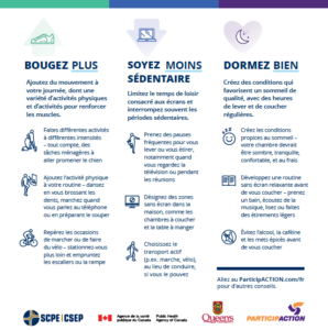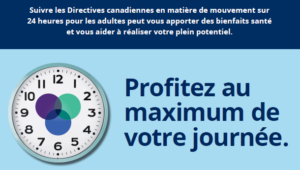 Pour bien en profiter, nous devons tenir compte des recommandations de santé publique pour ce qui est des comportements liés au mouvement. Ces recommandations, qui sont le résultat des recherches les plus complètes et les plus récentes, nous aident à nous orienter lorsque nous planifions notre journée, notre semaine ou notre mois. Des plans qui devraient toujours comprendre un peu d’activité physique.