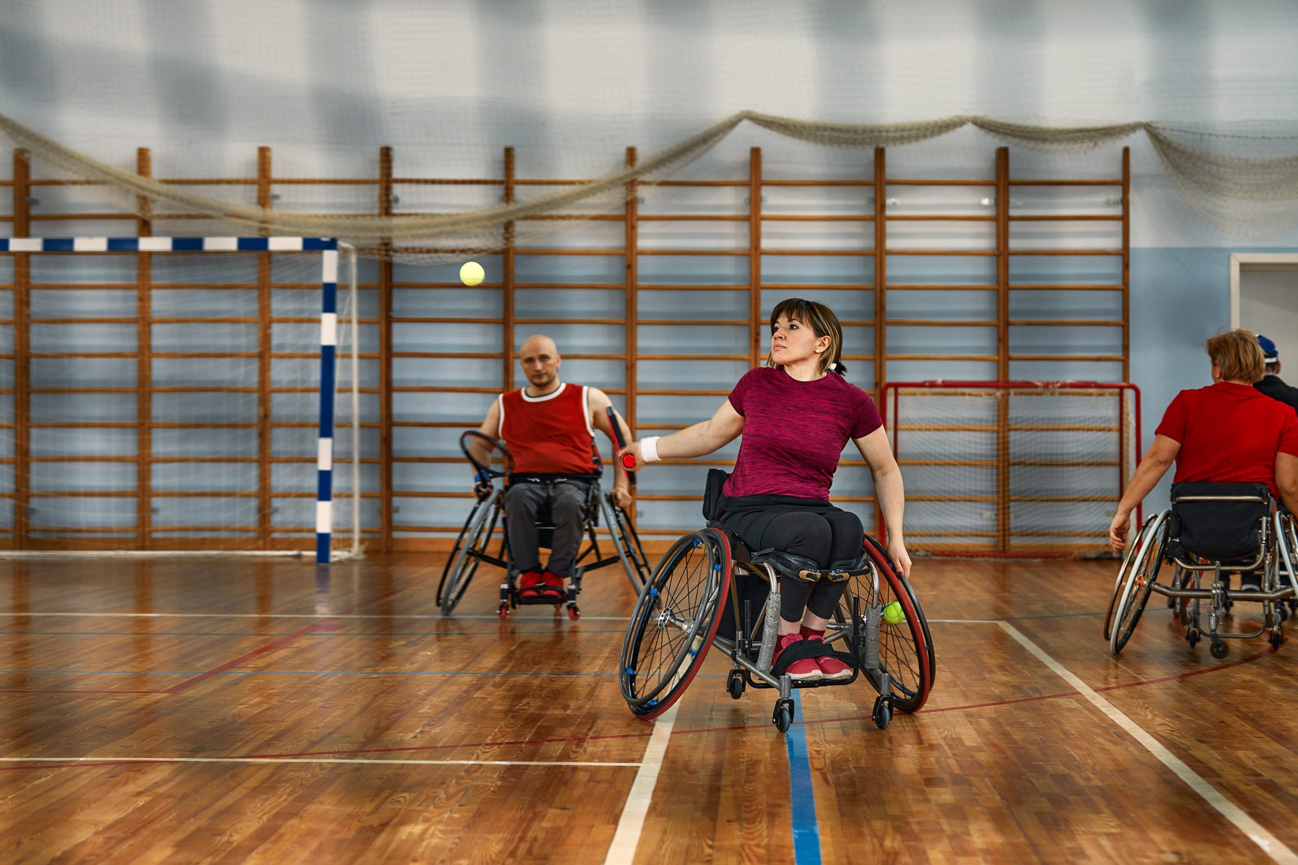 Trois personnes jouent au tennis en fauteuil roulant dans un gymnase intérieur.