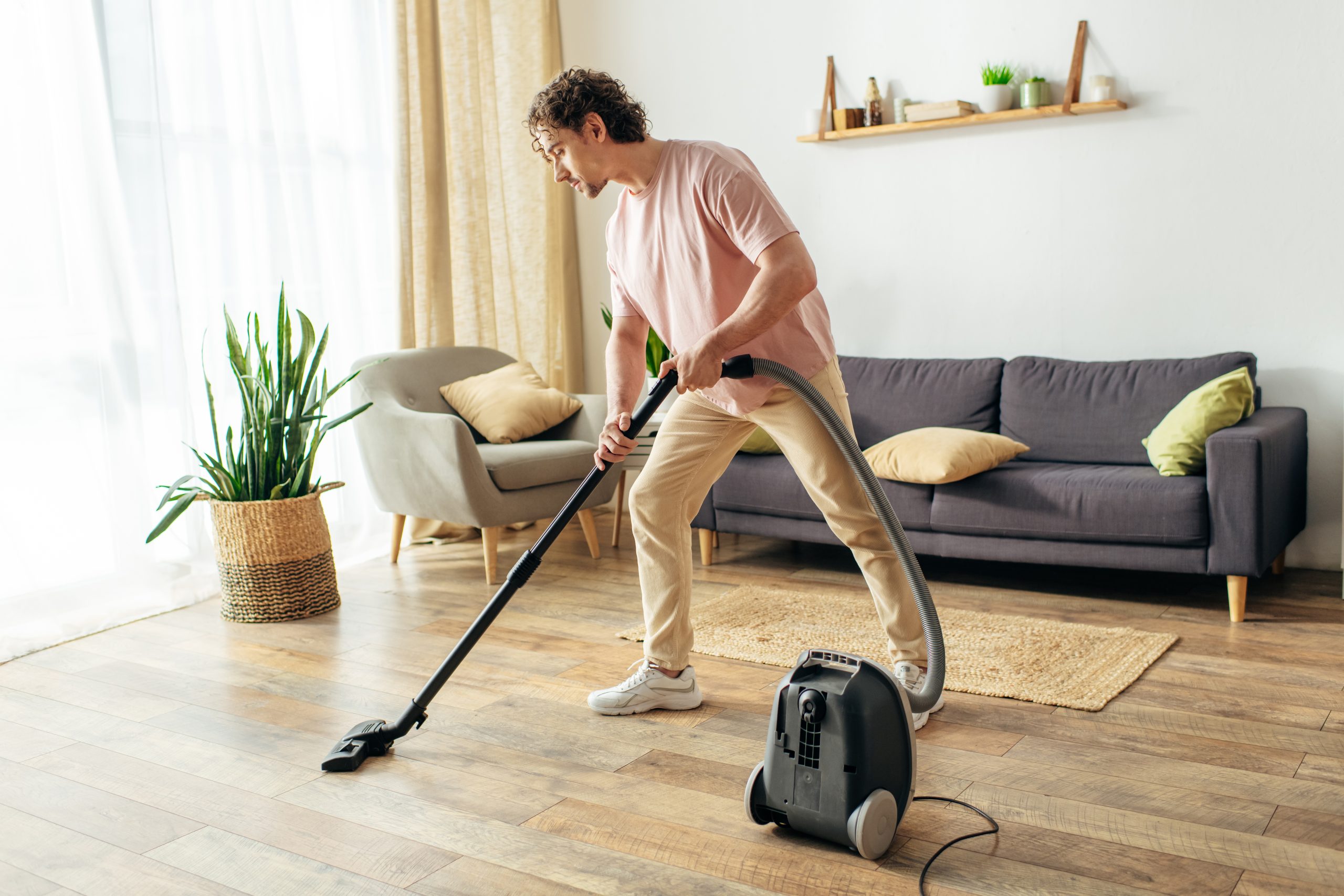 Un homme passe l’aspirateur sur un plancher de bois franc dans un salon avec un canapé, un fauteuil et une plante en pot.